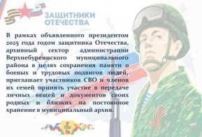 В рамках объявленного президентом 2025 года защитника Отечества, архивный сектор администрации Верхнебуреинского муниципального района в целях сохранения памяти о боевых и трудовых подвигов людей, приглашает участников СВО и членов их семей принять участие в передаче личных вещей и документов своих родных и близких на постоянное хранение в муниципальный архив